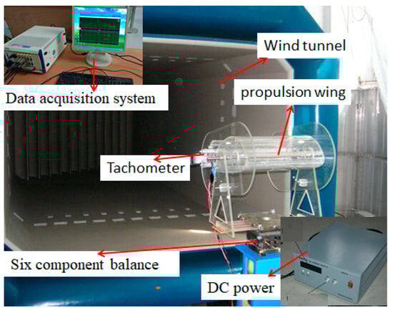 An experimental setup for aerodynamic measurements of the propulsive wing was devised, as depicted in Figure 6. It consists of five main components: the propulsive wing system, measurement system, power system, rotational speed control system, and low-speed return flow wind tunnel. The propulsive wing is mounted on a six-component balance for measuring aerodynamic forces and moments. The CFF is driven by a 1.3 kW DC motor, and its rotational speed is controlled by an electronic speed controller. The motor is connected directly to the fan without a gearing system. For enhanced experimental safety, the maximum speed of the CFF is limited to 3000 r/min. The test section of the wind tunnel measures 3.2 m × 2.4 m, with a maximum wind speed of 50 m/s. The basic specifications of the DC stabilized power supply include an input AC voltage of AC220V ± 10%, frequency of 50 Hz, safe operating voltage range of 0–60 V, and safe operating current range of 0–100 A. The frontal area of the experimental platform is relatively small, which reduces aerodynamic interference with the test model. Additionally, adjustments to the position of the installation holes can be made quickly to adjust the incoming flow angles of attack, meeting the varied requirements of the experiment.