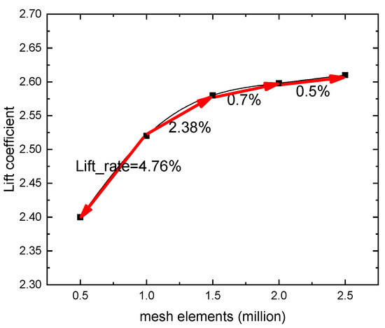 Insufficient mesh quantity affects computational accuracy, while excessive mesh quantity impairs computational efficiency. Therefore, it is necessary to select an appropriate mesh density [25]. When investigating the influence of mesh density on computational results, five distinct mesh densities were utilized, specifically 0.5 million (overall sparse), 1 million (baseline), 1.5 million (rotation zone refinement), 2 million (encryption zone refinement), and 2.5 million (overall refinement). Figure 9 illustrates the computational results and iteration errors of the propulsive wing under different mesh densities, with a cross-flow fan rotating speed of 3000 r/min, an angle of attack of 40°, and a free-stream velocity of 10 m/s. It can be observed that the mesh density around the cross-flow fan significantly affects the computational results, followed by the encryption area. Considering both computational accuracy and efficiency, 1.5 million meshes were selected for calculating the aerodynamic performance of the propulsive wing.
