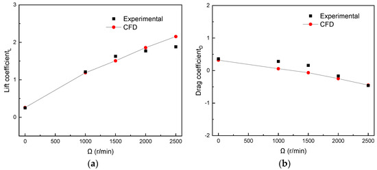 Comparison of CFDs calculation and experimental results at an angle of attack of 10° and a free-stream velocity of 10 m/s. (a) Lift coefficient. (b) Drag coefficient.