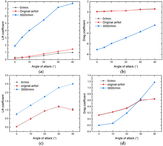 The variation in the drag coefficient with free-stream velocity is illustrated in Figure 19b. With the angle of attack and rotational speed held constant, the drag coefficient increases continuously as the free-stream velocity increases, leading to a decrease in the advance ratio. With further increases in the free-stream velocity, the advance ratio continues to decrease, indicating the insufficient suction capacity of the cross-flow fan, causing the propulsive wing to stall. Consequently, there is a significant decrease in the lift coefficient and a substantial increase in the drag coefficient.