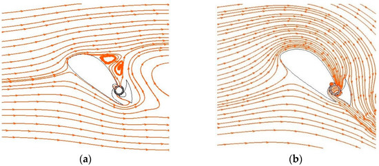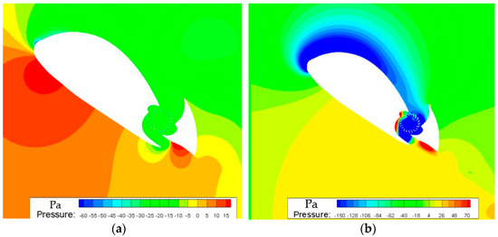 To gain further insight into the mechanism behind the high lift performance of the propulsive wing at high angles of attack, the time-averaged streamlines were further analyzed when the cross-flow fan rotates at 3000 r/min and when it remains stationary, as shown in Figure 12. Evidently, when the fan is stationary, severe airflow separation occurs on the suction surface of the airfoil, leading to complete stall of the wing. Large vortex regions can be observed, and the wake of the airfoil is significantly disturbed, which severely affects the aerodynamic characteristics of the wing. In contrast, when the fan rotates, a strong suction effect is generated, introducing a large amount of turbulence into the cross-flow fan and promoting stable airflow attachment on the airfoil surface. This effectively eliminates the phenomenon of airflow separation on the suction surface. Comparing the two cases, when the fan is not rotating, the suction surface of the airfoil experiences large areas of high pressure due to severe airflow separation, as shown in Figure 13a. Conversely, when the fan rotates, the airflow velocity on the upper surface of the airfoil increases, resulting in reduced pressure, as depicted in Figure 13b. Consequently, the pressure difference between the upper and lower surfaces becomes more significant, thereby improving the lift performance of the propulsive wing. By attracting air onto the suction surface, energizing it, and expelling it from the trailing edge of the airfoil, the CFF effectively prevents flow separation at high angles of attack and achieves a relatively high lift coefficient.
