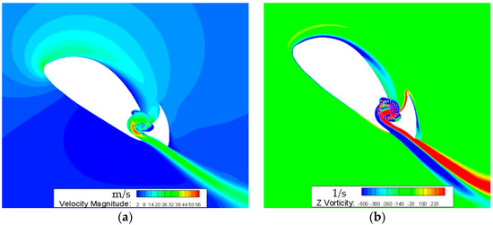 Contour velocity and contour vorticity, with a cross-flow fan rotating speed of 3000 r/min, an angle of attack of 40°, and a free-stream velocity of 10 m/s. (a) Contour velocity. (b) Contour vorticity.