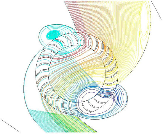 Through the calculation analysis in Appendix A, it is evident that throughout the flow process from the inlet to the outlet of the propulsive wing, the total pressure along the circumference of the fan varies, and the airflow exhibits vortices. Vortices are formed inside the fan, and there are two vortices due to the presence of both the inlet and outlet openings, which can be seen in Figure 15.