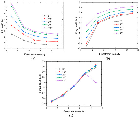The relationship between the torque coefficient and free-stream velocity is depicted in Figure 19c. With the angle of attack and rotational speed held constant, the torque coefficient shows a linear increasing trend with the increase in free-stream velocity. Moreover, at different angles of attack but the same free-stream velocity, the torque coefficients remain similar. As mentioned earlier, when the rotational speed is constant, the mass flow rate entering the cross-flow fan remains unchanged. However, with increasing free-stream velocity, the direction of the airflow entering the inlet changes, hindering the rotation of the blades near the inlet. This results in an increase in the torque coefficient. When the free-stream velocity is constant, the mass flow rate entering the cross-flow fan remains consistent at different angles of attack, indicating that the mass flow rate entering the cross-flow fan is independent of the angle of attack and dependent on the rotational speed [29].