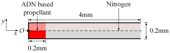 In this paper, the two-dimensional transient simulation of the combustion process of a gaseous ADN-based propellant in a straight nozzle is carried out. The nozzle with an ADN-based propellant is shown in Figure 1, with a length of 4 mm, a bottom width of 0.2 mm, and an expansion angle of 0°. The propellant filling length is 0.2 mm, and the rest of the nozzle is filled with nitrogen. Considering the symmetry of geometry and flow, the upper part is taken for meshing and numerical calculation.