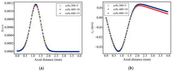 In computational geometry, the symmetrical boundary condition is used at the axis of symmetry, the zero gradient boundary condition is used at the outlet, and the other boundaries are set as no-slip walls. In order to ensure the accuracy of the calculation results and improve the calculation efficiency, the grid independence test is carried out in case 1. The number of grids is 200 × 5, 400 × 10, and 600 × 15, respectively (corresponding to the X and Y directions, structured grid). The distribution of ADN mass fraction and X-direction velocity on the central axis at 5 ms is surveyed. The results are shown in Figure 2, and the corresponding maximum values of ADN mass fraction and X-direction velocity are shown in Table 2. It was found that the calculation results of the 200 × 5 grid are different from those of the latter two grids, while the calculation results of the 400 × 10 grid and 600 × 15 grid are consistent, indicating that few grid numbers can cause the loss of effective information. At the same time, considering the calculation efficiency, the calculation time of the 400 × 10 grid is faster than that of the 600 × 15 grid, so the 400 × 10 grid distribution is adopted for all subsequent calculations. In order to ensure the accuracy of the calculation and minimize the diffusion caused by time discretization, the initial time step is set to 1 × 10−11 s, the maximum Courant–Friedrichs–Lewy (CFL) number is set to 0.2, and the maximum time step is set to 1 × 10−6 s.