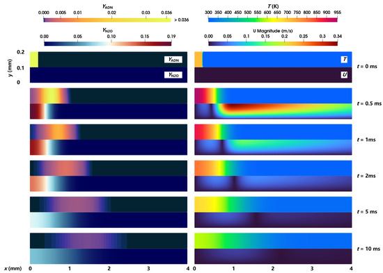 Distribution of the ADN mass fraction, N2O mass fraction, temperature, and velocity magnitude at different times.