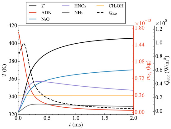 Figure 4 shows the variation of average temperature, total mass of five components (ADN, N2O, HNO3, NH3, and CH3OH), and average heat release rate in the straight nozzle with time in case 1. As shown in Figure 4, the average heat release first increased within 0–2 ms, reached its peak at 0.1 ms, then rapidly decreased and approached 0. Correspondingly, the average temperature inside the nozzle first rose rapidly and then tended to flatten, rising from 323 K to 406 K. By analyzing the total mass curves of the five components, it can be seen that the total mass of ADN decreased rapidly from time 0, and the total mass of the ADN pyrolysis products, N2O, HNO3, and NH3, increased continuously before 0.25 ms, resulting in a rapid rise in the temperature inside the nozzle. After 0.25 ms, the mass of NH3 began to decrease slowly, and HNO3 decreased faster. This is because HNO3 continued to decompose to produce N2O. Under the combined influence of ADN pyrolysis and HNO3 decomposition, N2O kept an upward trend after 0.25 ms, but, due to the rapid reduction in ADN content, the upward trend of N2O also gradually slowed down. It is worth mentioning that, as one of the main components of propellants, the total mass of CH3OH had remained unchanged, indicating that its oxidation reaction did not start, which can be attributed to the CH3OH aggregation region not reaching its reaction temperature.