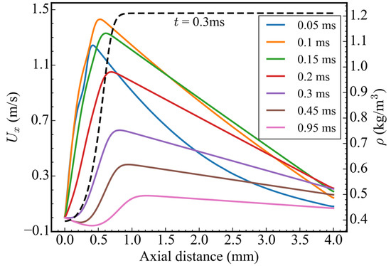 Figure 5 shows the velocity distribution in the x-direction along the central axis at different times. Before 0.3 ms, the velocity exhibited a profile of initially increasing and then decreasing along the x-direction. Under the action of the temperature gradient, the maximum velocity of 1.24 m/s appeared at x = 0.42 mm, i.e., in front of the ADN-based propellant at 0.05 ms. With the pyrolysis of ADN, the temperature in this area increased, and, hence, the flow velocity also gradually increased. At 0.1 ms, the peak velocity of 1.43 m/s appeared at x = 0.535 mm, and the peak moving velocity was 2.3 m/s. Then, the peak velocity continued to decrease, and the position of peak velocity also continued to move forward, but the moving velocity continued to decrease. After 0.3 ms, the velocity presented an “S” shape distribution along the x-direction. By investigating the density distribution at 0.3 ms, it can be concluded that the negative velocity near the bottom wall was due to the negative flow caused by the density difference.