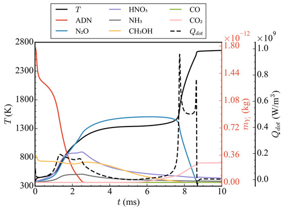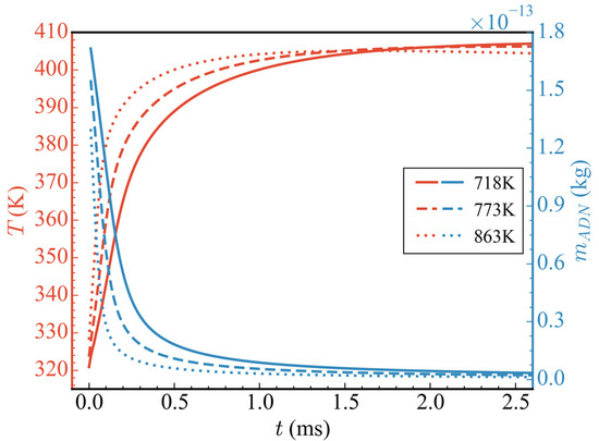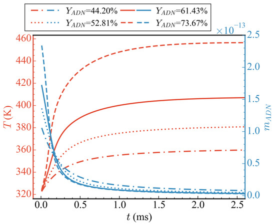 Temporal evolution of average temperatures and total ADN mass at different initial propellant ratios.
