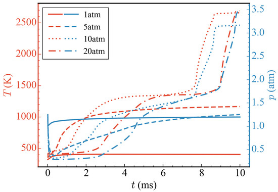 Figure 9 shows the temporal evolution of the total mass of ADN and CH3OH at different initial pressures. With the increase in initial pressure, the initial total mass of ADN and CH3OH also increased accordingly. Although high pressure was conducive to the reaction near t = 0, the rapid release of high initial pressure created a low-pressure environment in the nozzle, which would slow down the reaction rate after the low-pressure environment was generated. Therefore, the consumption rate of ADN and CH3OH did not increase proportionally with the increase in initial pressure. When the initial pressure was 1 atm, the time for ADN to decompose completely was 0.5 ms; when the initial pressure was 5 atm, the time for ADN to decompose completely was 4.5 ms; and when the initial pressure was 10 atm, the time for ADN to decompose completely was 2.5 ms, which was nearly twice as fast as 5 atm. At an initial pressure of 20 atm, the time for ADN to decompose completely was similar to that at 5 atm. Among the four cases mentioned above, only when the initial pressure was 10 atm or 20 atm, CH3OH was completely consumed, while at 5 atm, it was partially consumed. Based on the changes in average temperature at different initial pressures mentioned earlier, it can be speculated that CH3OH did not undergo a drastic oxidation reaction due to insufficient temperatures or reaction times.