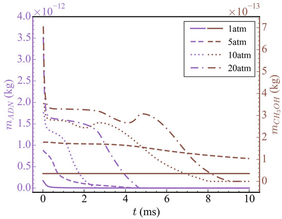 Temporal evolution of the total mass of ADN and CH3OH at different initial propellant pressures.
