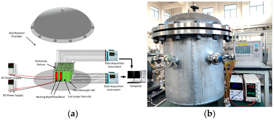 The installation of cells should consider spacing and heat transfer characteristics to maximize the potential for propagation of the other cells. Therefore, to characterize the most serious TR heat propagation, the cells are arranged in the closest way, as depicted in Figure 2a. Thus, the bottom plate with special size is customized as the base for installing the LIB unit, as shown in Figure 2b. According to previous research experience, if there are contents spraying out of a cell in large amounts during TR, it will take away more heat [30]. This situation means that the real scenario cannot be simulated. To prevent it from happening, a 2 cm thick stainless-steel plate is installed on the upper surface of the LIB module, and a layer of insulating fireproof cotton is placed between the LIB and the stainless-steel plate to prevent short circuits. Figure 2c illustrates how the upper and lower base plates are connected and fixed by four screws.