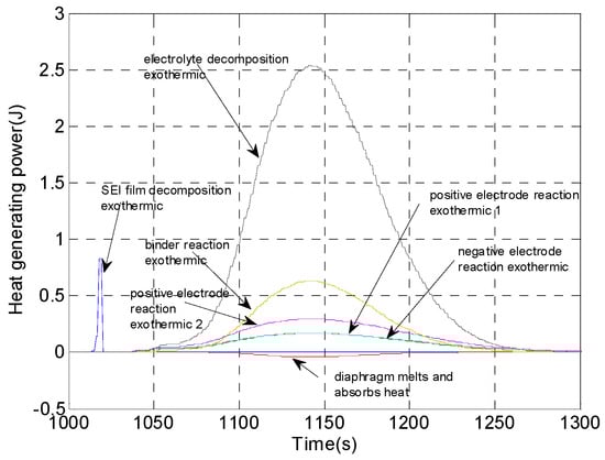 The parameters in Equations (1)–(3) can be evaluated based on experience [36,37,38,39]. Temperature change becomes an important variable in the cell reaction kinetics equation and heat release equation. Figure 3 illustrates the thermal power generated at each stage of a single cell’s TR process.