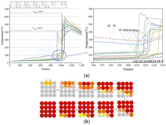 TR behavior of LIB module when overheat top corner position cells: (a) temperature curve of No. 1~No. 16 cells; (b) schematic diagram of TR propagation of LIB module.