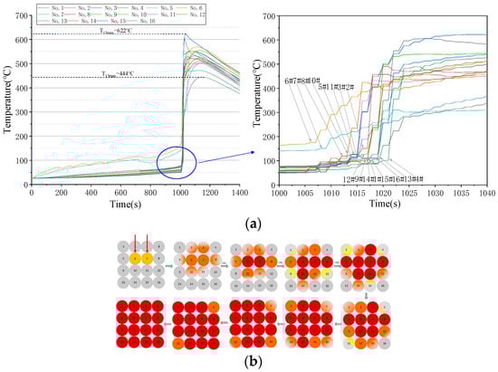 Triggering TR by overheating the whole module simultaneously is simulating a failure phenomenon of multiple-battery TR caused by common-mode faults in the system. Although this failure mode is rare, it cannot be ruled out. Figure 7a illustrates the TR monitoring temperature curve of each cell.