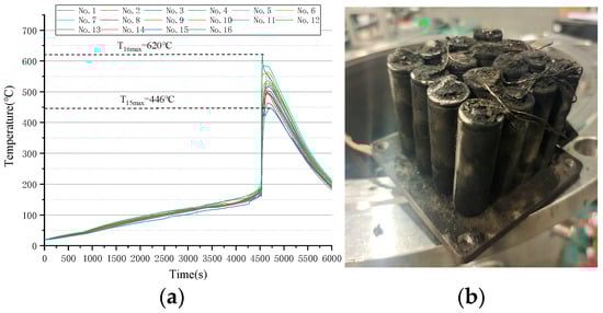 TR behavior of LIB module when overheat the whole module: (a) temperature curve of No. 1~No. 16 cells; (b) LIB module after TR.