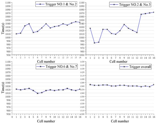 Figure 10 illustrates the real-time voltage monitoring curve of each cell in the experiments of four different trigger positions and modes. For the mode of triggering two adjacent cells, only the voltage changes of the two triggered cells are complex, and the voltage value obviously drops to 2.0 V~2.5 V near 600 s, and then continues to drop until the final voltage value is 0 V. However, the voltage reduction trend of other peripheral cells in the LIB module is very consistent and there is no repetition.
