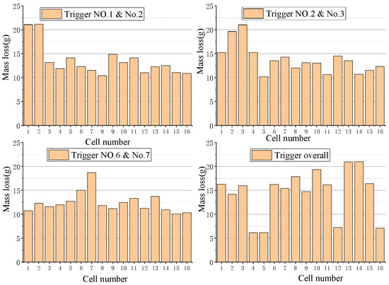 (4) Common-mode faults in the LIB system may cause a whole-module TR. Triggering TR by overheating the whole module simultaneously is simulating this failure phenomenon. Overheating the whole module results in more mass loss of solid ejecta; that undoubtedly causes more damage and high heat transfer to the surrounding environment and other cells. Therefore, in a certain sense, this verification method can more adequately test the aircraft’s containment of LIB TR.