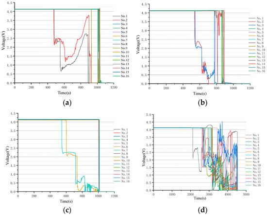 Voltage curve of No. 1~No. 16 cells: (a) Trigger No. 1 + No. 2 cells; (b) Trigger No. 2 + No. 3 cells; (c) Trigger No. 6 + No. 7 cells; (d) Trigger of the whole LIB module.