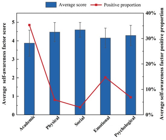 Figure 2 presents the average scores of the five dimensions and the positive proportion in the self-awareness scale. The mean value of the academic self-awareness factor, which was only slightly below 4 points, showed a significant decrease compared to the other four factors, whereas the average scores of the remaining four factors did not vary significantly. Furthermore, the positive proportion of academic self-awareness factors was the highest at 35.3%, while for the other four dimensions, it ranged from 2.9% to 14.7%. It indicated that the surveyed civil aviation flight cadets exhibited poor academic self-awareness while demonstrating relatively strong and consistent levels of physical, social, emotional, and psychological self-awareness.