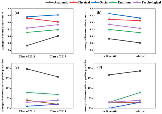 Self-awareness factor scores and proportion of positive samples across different grades and training school locations: (a) average factor score of self-awareness for Class of 2018 and 2019; (b) average factor score of self-awareness in domestic and abroad; (c) average factor positive proportion of self-awareness for Class of 2018 and 2019; (d) average factor positive proportion of self-awareness in domestic and abroad.