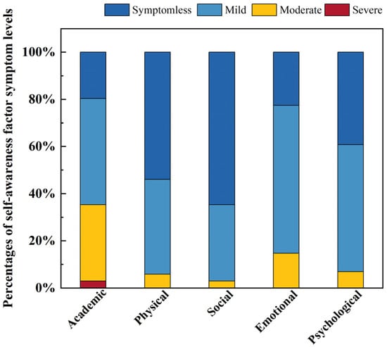 Figure 4 illustrates the distribution of scores across the five dimensions of the self-awareness scale, which are divided into symptomless, mild, moderate, and severe. It was evident that among the five factors, academic self-awareness was the only factor displaying severe symptoms, with a proportion of 2.9%. The proportion of moderate symptoms varied from 2.9% to 32.4%, with the highest proportion observed for academic self-awareness problems, followed by emotional self-awareness. In general, a high proportion of factors exhibited mild and symptomless factors (scores ranging from 3.5 to 5), suggesting that the self-awareness of most flight cadets was predominantly favorable.