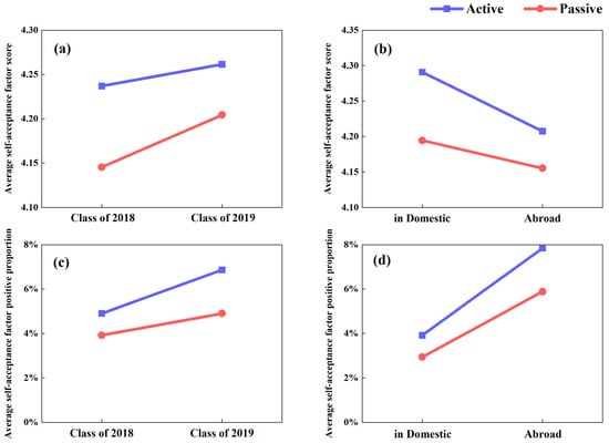 Self-acceptance factor scores and the proportion of positive samples across different grades and training school locations: (a) average factor score of self-acceptance for the Classes of 2018 and 2019; (b) average factor score of self-acceptance in domestic and abroad; (c) average factor positive proportion of self-acceptance for the Classes of 2018 and 2019; (d) average factor positive proportion of self-acceptance in domestic and abroad.
