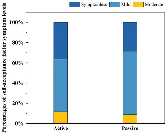 As shown in Figure 7, neither of the two dimensions of the self-acceptance scale reflected severe symptoms. Active and passive self-acceptance demonstrated comparable rates of moderate symptoms. Consistent with the results from the self-awareness scale, the self-acceptance scale revealed a significant prevalence of mild and symptomless factors, suggesting that a majority of the pilot students have a good self-acceptance status.
