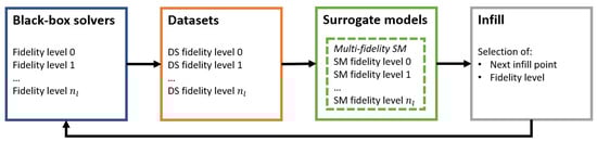 All surrogate-based techniques have the same iterative architecture in common which can be summarized in three phases: fit the surrogate models based on the available data, identify the next sample (or samples in case of batch-sampling techniques) via an infill criterion, and evaluate the resulting design by means of the selected analysis tools as shown in Figure 1. The process is repeated until a prescribed convergence criterion is reached, or the whole computational budget is consumed. Even though there might be some differences in the implementation of the iterative algorithm, the choice and definition of the infill criterion are the main distinctive characteristics of each surrogate-based technique []. In particular, the infill criteria specifically designed for multi-fidelity sampling are able to determine not only the next infill sample but also the fidelity level to consider for the design evaluation.