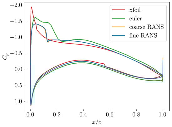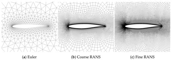 The supercritical RAE2822 airfoil serves as a baseline configuration for this investigation, and its aerodynamics performance is assessed by four different fidelity levels. The lowest fidelity level is obtained by solving the potential flow, including a compressibility correction employing the XFoil software v.6.99 [,]. The second lowest fidelity level solves the Euler equations, while the two highest fidelity levels are based on the RANS equations in conjunction with the Spalart Allmaras turbulence model, applied to two grids with varying mesh density. The CFD solutions based on a finite volume method, i.e., solutions to the Euler and RANS equations, are computed using the DLR TAU Code [], and the corresponding computational grids are shown in Figure 3.