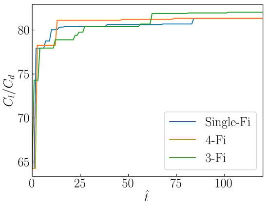 Firstly, the optimization problem in Equation (18) is initially solved using a single-fidelity surrogate based optimizer. Such an optimization solution establishes a baseline performance, which will later serve as a point of comparison for the performance of the surrogate-based optimizer with the two-step multi-fidelity sampling. The initial surrogate model is a Gaussian process model with a Gaussian Exponential kernel and constant mean, and the training is completed using 50 initial samples generated via a Sobol sequence. The choices of the Gaussian process kernel and of the number of initial samples aim at achieving a root mean squared error below 10% and a maximum prediction error below 20% with respect to a test dataset made of 10 random samples. The convergence history of optimal is visualized in Figure 5 as a function of unit time , where represents the cumulative evaluation time divided by the evaluation time of the highest fidelity level, namely, the fine RANS simulation.