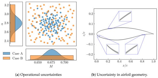 The surrogate-based uncertainty quantification described in Section 2.5 is employed to propagate uncertainties in (i) operating conditions—Mach number M and angle of attack , and (ii) geometrical representation of the airfoil using CST coefficients (Section 3.1). As shown in Figure 8, case A and B (later B1, B2) refer to low (informative) and high (uninformative) uncertainty levels (distributions) in operating conditions, respectively. In order to study the effect of varying , its default value of 0.7 is used for cases A and B1, and a value of 0.5 is used for case B2. The uncertainty in (CST) design vector results in about 1% variation in the airfoil geometry and is consistent for all three cases. The Quantity of Interest (QoI) considered is the lift-to-drag ratio which is the same as that considered for optimization. However, under the presence of uncertainties, a rather important quantity is the mean of QoI.
