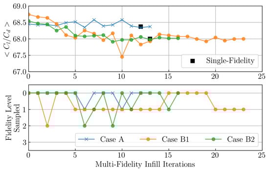 Figure 9 shows the infill history of multi-fidelity surrogate-based uncertainty propagation. Note that (i) iteration zeros refer to the last sample in the DoE stage, and (ii) the converged statistic values for single-fidelity investigation are shown with black squares. The multi-fidelity approach for Case A results in samples mostly from the highest fidelity with only a couple of samples from the lower levels. For relatively precise inputs in Case A, the surrogate errors are rather small. As a consequence, the Jensen–Shannon divergence (JSD) between these surrogates at different locations is mostly larger than the default value, resulting in samples predominantly from the highest fidelity level. As the input uncertainty is increased, i.e., Case B1, the surrogate errors become larger, resulting in the majority of the samples being from lower fidelity levels. Consequently, the convergence takes more iterations as compared to Case A. In Case B2, with the same level input uncertainty as Case B1, the is lowered to a value of 0.5. This allows for a balanced sampling between fidelity levels with enough samples from the highest fidelity to make an accurate prediction of the mean lift-to-drag in a smaller number of infill iterations.