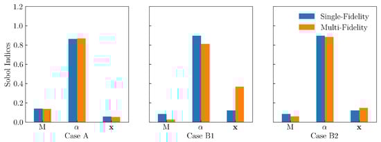 Sobol indices are used to attribute the variance in the QoI () to different input uncertainties, providing a sensitivity analysis. A high Sobol index for an input parameter indicates its significant impact on the output’s variability. The bar charts in Figure 11 compare the sensitivity of the lift-to-drag ratio to the Mach number (M), angle of attack (), and the CST design vector () under single- and multi-fidelity strategies for the low and high uncertainty levels. For all the three cases, the single-fidelity analysis show that the variability in is dominated by the uncertainty in the angle of attack. Although small, the impact of the Mach number and geometrical uncertainty is not negligible in Case A and Case B(1,2), respectively. Similar to the box-plot results, and for the same reasoning, the multi-fidelity approach estimates of the Sobol indices are fairly accurate for Case A, inaccurate for Case B1, and reasonably accurate for Case B2, indicating the correlation between the uncertainty level and .