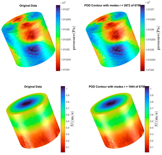 Instantaneous snapshot surface contours of variables at t = 0.01 s. (Left): Original data. (Right): Reduced data (POD).