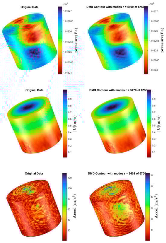 Instantaneous snapshot surface contours of variables at t = 0.01 s. (Left): Original data. (Right): Reduced data (DMD).