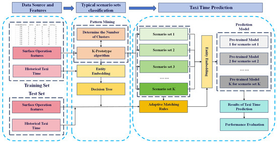 In this paper, the K-prototype clustering method is adopted to classify and form typical scenario sets. Subsequently, two adaptive matching methods for scenarios are proposed based on the result of scenario classification. Additionally, the matched target scenario data will then be combined with the pre-trained taxiing time prediction models corresponding to their respective scenario sets. The above processes constitute a taxiing time prediction method based on adaptive scenario matching rules. The process is illustrated in Figure 2.