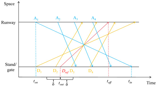 SOE features refer to the estimated traffic situation characteristics during the taxiing process of departure aircraft. These features primarily reflect the potential interactions between the target departure aircraft and other departure or arrival aircraft. Based on the author’s previous research on airport surface movement [13], eight traffic features based on spatiotemporal network topology structures were used. These features comprehensively consider the relationships between departure or arrival flights, as shown in Figure 3. In the figure, the behaviour of flights between the runway and stand/gate and the relationships between aircraft are visualized. Dref represents the target departure aircraft, An represents an arrival aircraft, and Dn represents other departure aircraft. In the subsequent description, we will use this image to provide examples of the calculation methods for each indicator to facilitate understanding. It should be noted that the figure is for illustrative purposes only, representing the possible relationships between flights, and the actual taxiing pattern is not unique.