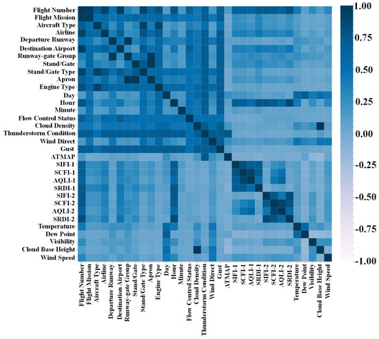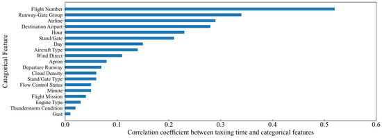 In this study, correlation analysis is applied to select the most critical features that affect taxiing time. However, there are two types of features involved in this study, namely categorical features and numerical features. Considering the different types of features, a single correlation evaluation metric is considered insufficient. Therefore, this study adopts Cramer’s V coefficient, Pearson’s correlation coefficient, and the sample correlation ratio to analyze the correlations between categorical features, numerical features, and the correlation between categorical and numerical features. In addition, partial correlation analysis is used to differentiate whether the correlation between two variables is influenced by a third variable.