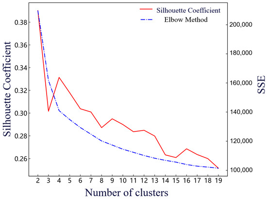 As shown in Figure 6, this paper adopts a combination of the elbow method and silhouette coefficient to analyze the optimal number of clusters. The optimal number of clusters is determined to be four with the K-prototype algorithm.