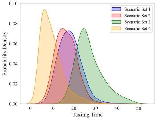 The number of flights in the four generated scenario sets is as follows: 6834 flights, 11,165 flights, 6008 flights, and 11,030 flights. In Figure 7 and Figure 8, partial clustering results are presented, and significant differences can be observed among different sets. In Scenario set 1, flights are primarily departures with a higher occurrence during the morning and noon peaks. In Scenario set 2, flights are mainly arrivals and are primarily distributed throughout the afternoon and evening. Scenario set 3 has the longest average taxiing time and is concentrated during the morning and noon peaks. Scenario set 4 has the lowest number of flights and is distributed throughout the day The flights in this scenario set are concentrated on the third apron (freight apron), with a predominance of medium to large aircraft types. The number of flights on the surface involved in each scenario in this set is significantly smaller than the other three sets. Additionally, the flights in the scenarios mainly consist of cargo flights. The probability density distribution of taxiing time for each scenario set is shown in Figure 9. The taxiing time distributions in Scenario sets 1 and 2 are similar, while Scenario set 3 exhibits a wider range of values, and the taxiing times in Scenario set 4 are concentrated at lower values.