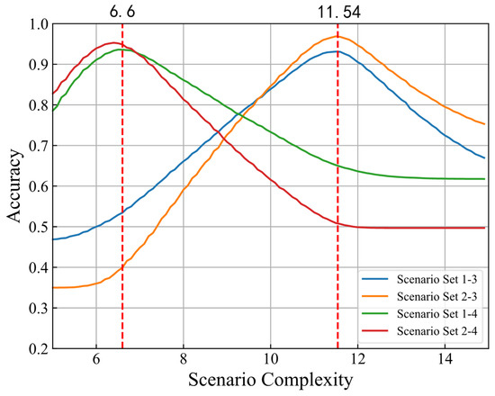 The complexity thresholds in this method are provided in Figure 12, where the two red lines correspond to the significant boundaries observed in the left-hand graph of Figure 11. The calculation method of involves the peak value of the highest division accuracy between adjacent different scenario sets and taking the average of the two boundaries on the same side. As for , the value of the highest accuracy is directly extracted. According to the results obtained from the test set, the overall accuracy of this method is 85.3%. It can ensure a relatively high level of accuracy in scenario matching.