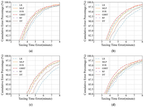 The results, as shown in Figure 13, illustrate the cumulative error distribution of taxiing time prediction for each scenario set. Among all the methods, it can be observed that the accuracy of prediction is highest for the departure peak scenario. However, there is a larger deviation in the prediction results for the arrival–departure peak scenario. This is because the departure peak scenarios occur in a more concentrated manner, with a relatively homogeneous mix of flight types. Higher accuracy can be achieved due to the simpler scenarios. On the other hand, the arrival–departure peak scenarios involve a diverse range of flight types and complex coupling between arrivals and departures. This makes taxiing time prediction challenging within these scenarios.