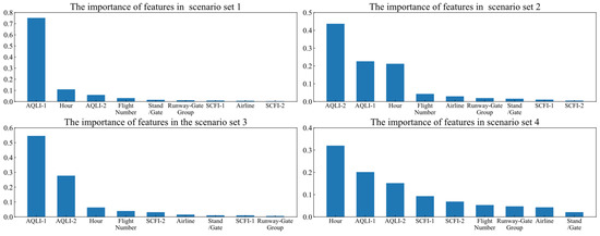 Feature importance is calculated through the taxiing time prediction process for each scenario set. Further analysis can be conducted to identify the key factors influencing taxiing time by ranking them in different scenario sets. As shown in Figure 14, it can be concluded that among the features of various scenarios, the variables hour, AQLI1, and AQLI2 generally have higher importance than other features. However, the ranking of feature importance also varies depending on the scenario sets. For example, in the departure peak scenario set, AQLI1 is the most critical feature, while in the arrival peak scenario set, the most critical feature is AQLI2. This is the same as the actual operational experience.