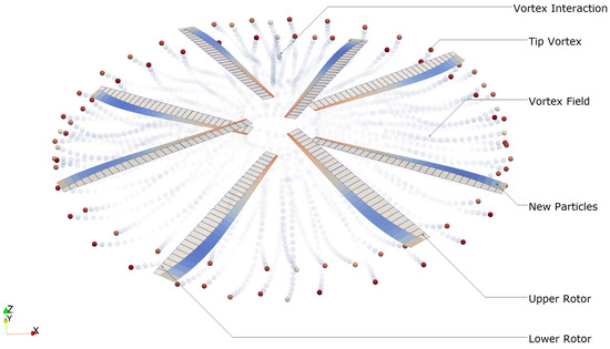 Based on the Kutta–Joukowski theorem, the bound circulation, , of the lifting line segment, as a solution to the non-linear problem [27], is linked to the aerodynamic coefficients. Each lifting line segment with bound circulation, , forms a closed vortex lattice with the corresponding trailed and shed vorticities. This vortex lattice has a length equal to the lifting line segment and a width equal to the blade chord, thus extending 1/4 chord length beyond the blade trailing edge. The strength of the vortex lattice, , matches the scalar value of the bound circulation, . As time steps forward, the vortex lattices are released from the blade trailing edge and are subsequently converted into newly formed vortex particles according to rules [28,29], moving with the local flow velocity. In this way, the lifting line model is coupled with the reformulated vortex particle model. As shown in Figure 1, the schematic of vortex particle generation illustrates the process in rigid coaxial rotors.