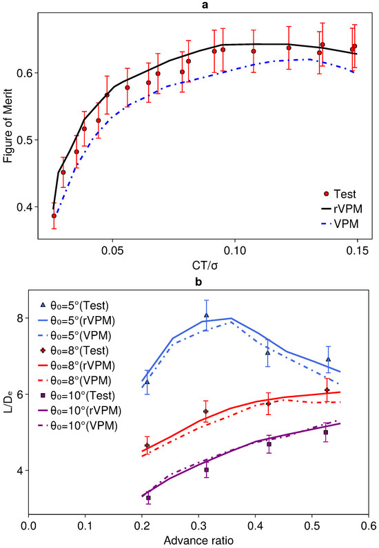 Figure 2 displays a comparison between the computational results of the developed aerodynamic model and experimental data, where the experimental data are derived from wind tunnel tests of a scaled model based on the X2TD coaxial rigid rotor [30]. The model rotor parameters are summarized in Table 1. Figure 2a shows the comparison of the coaxial rigid rotor’s hovering efficiency between test data and computational results, with the horizontal axis representing the blade loading coefficient, obtained by varying the collective pitch of the upper and lower rotors. As shown in the figure, the rVPM model predictions fall within the error bars of the experimental data, while the VPM model slightly underestimates the results but still agrees well with the experimental trends. A similar trend for VPM underestimation of coaxial rotor hover figure of merit was also observed in the study [31]. Figure 2b presents the comparison of the coaxial rigid rotor’s forward flight performance between test data and computational results, where the horizontal axis is the rotor’s advance ratio, , and the vertical axis is the equivalent lift-to-drag ratio, , in forward flight. The graph shows the equivalent lift-to-drag ratios at different collective pitches. A comparison reveals that both the rVPM and VPM results fall within the error bars of the experimental data and exhibit consistent trends. Quantitatively, the rVPM model demonstrates a mean absolute error (MAE) of 0.252 and a mean squared error (MSE) of 0.081, while the VPM model yields an MAE of 0.267 and an MSE of 0.103. The lower MAE and MSE values of the rVPM model indicate its overall closer agreement with the experimental data. A comparison of the experimental data, classical VPM results, and rVPM results reveals that the rVPM model exhibits higher accuracy in predicting hover performance, where flow field interference is significant. This improvement is likely attributed to the enhanced numerical stability of the rVPM algorithm. In forward flight, where the rotor wake is quickly convected away from the rotor disk due to the freestream velocity, resulting in reduced interference, the accuracy of both methods becomes more comparable.