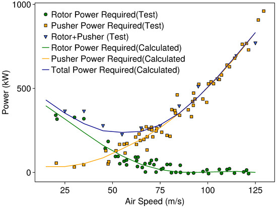 Following the simplified modeling approach proposed by Hersey et al. [32], simplified models of the fuselage, tail, and propeller were integrated with the rotor aerodynamic model developed in this study. The fuselage was treated as a rigid body, with its aerodynamic characteristics derived from wind tunnel test data. Rotor–fuselage interference was accounted for using empirical coefficients. The pusher propeller, mounted parallel to the aircraft’s x-axis, was modeled to generate thrust solely along its axis, neglecting the moment contribution from the reaction torque. At the target forward flight condition of , the propeller’s aerodynamic efficiency was assumed constant (0.85) and independent of thrust. The aircraft’s trim state was determined by solving a system of nonlinear algebraic equations that enforced equilibrium in lift and weight, torque balance between the two rotors, and a match between the calculated rolling moment and the lift offset value obtained from flight tests [33]. This iterative solution process also included the calculation of the rotor wake geometry. Using these models, the required power for the X2TD-like aircraft was calculated across various flight speeds and compared with flight test data. As shown in Figure 3, the numerical results demonstrate good agreement with the flight test data, validating the effectiveness of the developed method in predicting the performance of X2TD-like rigid coaxial rotors. It is important to note that the experimental results exhibit a significant degree of scatter, which is typical in such complex aerodynamic measurements. Despite this inherent variability, the numerical model accurately captures the overall trends and key performance metrics, indicating its robustness and reliability.