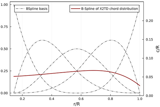 The chord length and twist angle distribution of the coaxial rigid rotor blades are expressed using B-spline curves. A B-spline is a linear combination of B-spline basis curves. An order B-spline curve (corresponding to a spline curve degree of m = n + 1) can be expressed as a linear combination of order B-spline basis curves: