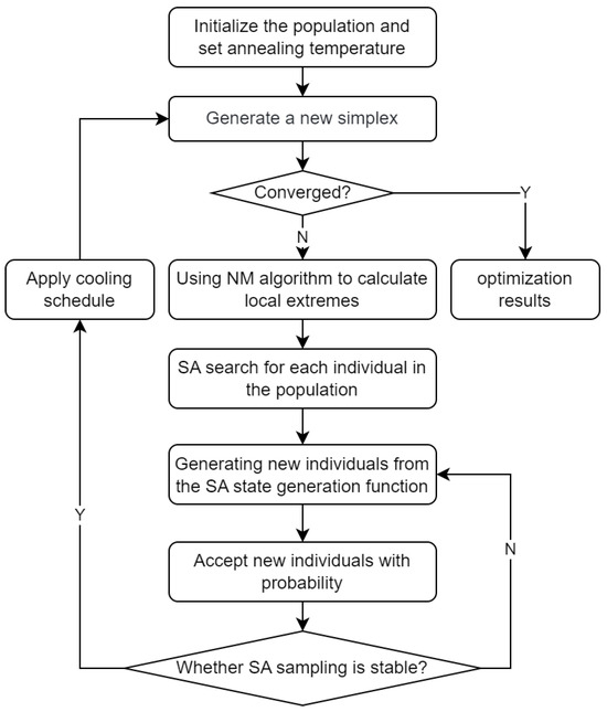 Figure 5 illustrates the flowchart of the SANM hybrid optimization strategy, integrating simulated annealing (SA) and the Nelder–Mead (NM) algorithms. The process begins with an initial random population, optimized first by NM to refine local minima. SA then takes over to explore global solutions, ensuring escape from local optima and enhancing the search for a global optimum. The flowchart highlights key transition points between algorithms, illustrating how the hybrid approach balances detailed local searches with broader global explorations to optimize performance efficiently.